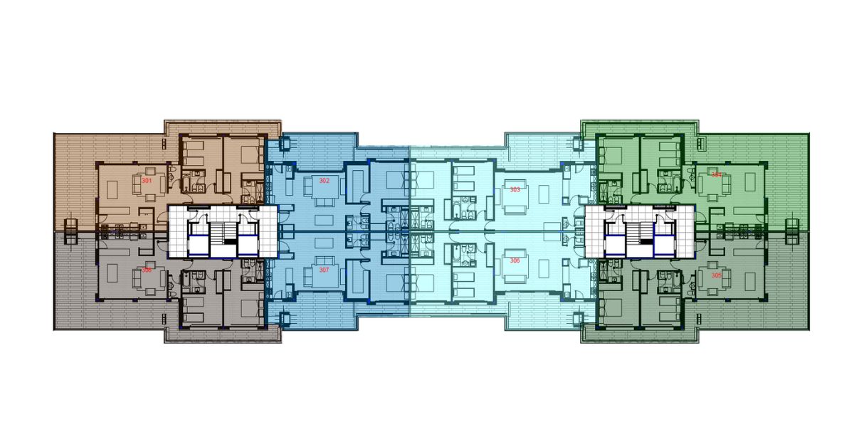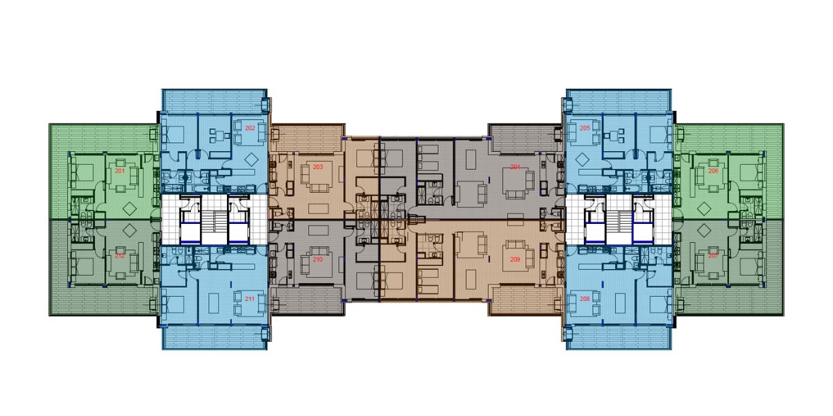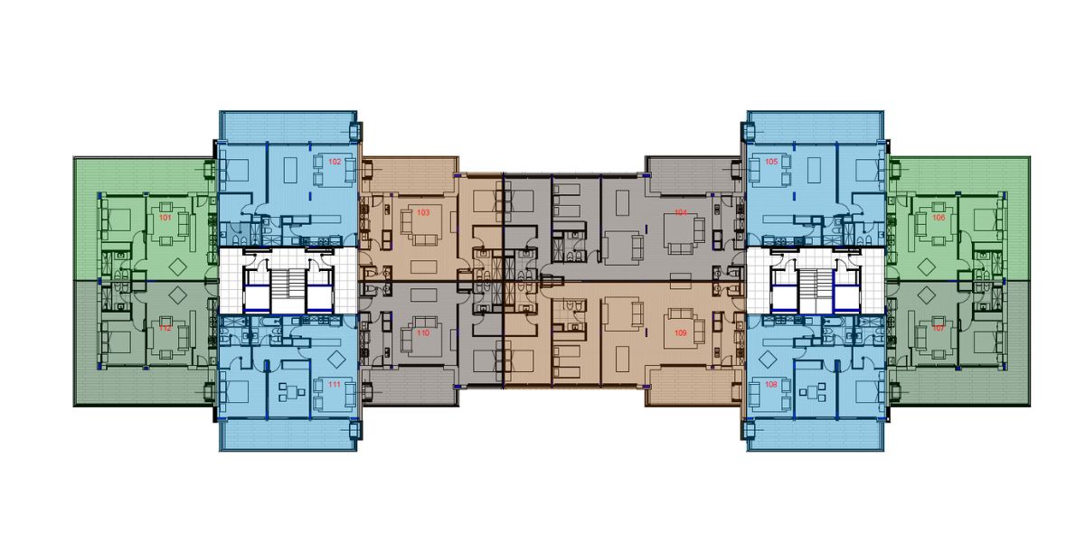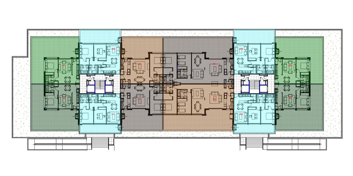 Las plantas están conformadas por 14 departamentos de un dormitorio 30 departamentos de 2 dormitorios.